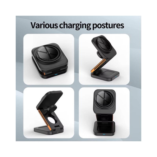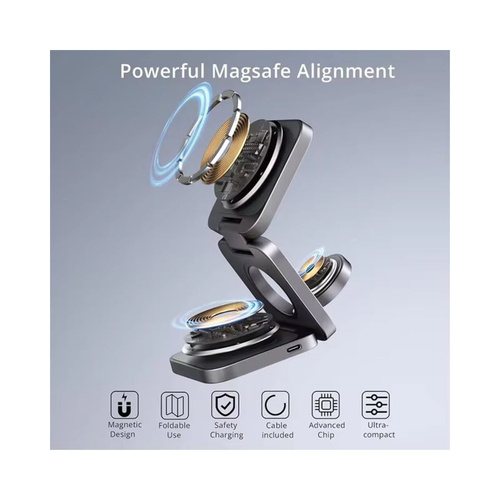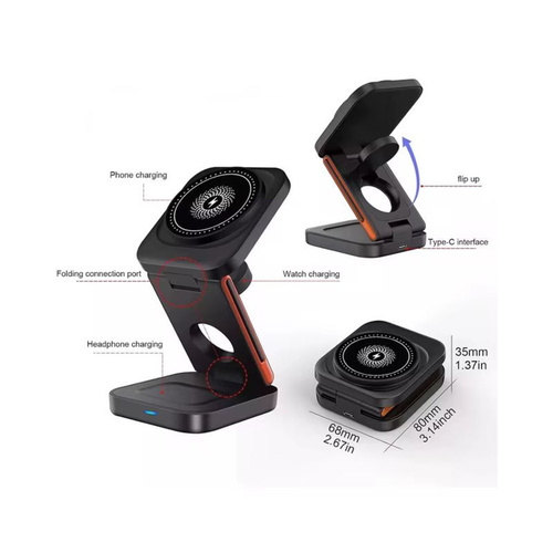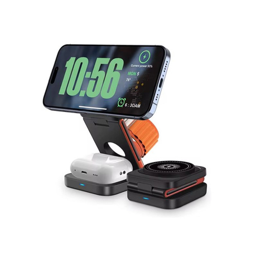 شارژر بیسیم مگنتی 3 در 1 تاشو 15 وات .این شارژر بیسیم مگنتی 3 در 1 تاشو 15 وات یک راهکار کامل و همزمان برای شارژ گوشی، اپل واچ و ایرپاد وایرلس است. طراحی تاشو و سبک این شارژر، آن را به گزینهای عالی برای میز کار، سفر یا استفاده خانگی تبدیل کرده است.ویژگیاصلی:شارژبیسیم 3 در 1: امکان شارژ همزمان گوشی، ساعت هوشمند و ایرپاد را فراهم. میکند.فقط با دستگاههای وایرلس کار میکند: این شارژر تنها برای گوشیها، اپل واچ و ایرپادهای دارای شارژ بیسیم Qi مناسب است.سازگار با اندروید: مدلهای اندرویدی که شارژ وایرلس دارند، کاملاً با این شارژر کار میکنند.سازگار با iPhone: مناسب iPhone 8 به بعد.سازگار با اپل واچ: مناسب تمام مدلهای دارای شارژ بیسیم.آماده برای استفاده: برای بهترین عملکرد، آداپتور شارژر حداقل 20 وات توصیه میشود. نکته مهم:این شارژر با دستگاههایی که شارژ وایرلس ندارند کار نمیکند. قبل از خرید مطمئن شوید گوشی یا دستگاه شما از شارژ بیسیم پشتیبانی میکند.مزایا:طراحی تاشو و قابل حمل ,شارژ همزمان چند دستگاه ,محافظت در برابر دما و جریان بیش از حد دلرد